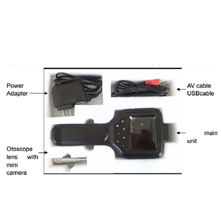 यो मेडिकल डिजिटल ईएनटी ओटोस्कोपमा CMOS क्यामेरा (लेन्स सहित), ह्यान्डहेल्ड युनिट, २.८ इन्च LCD स्क्रिन, रिचार्जेबल ब्याट्री, SD कार्ड र AV/USB केबलहरू समावेश छन्। ओटोस्कोप, Rhinoscope, Laryngoscope, पावर AV केबल, एडाप्टर USB केबल संग लागू क्यामेरा लेन्स। यसमा मेमोरीको लागि माइक्रो एसडी कार्ड छ।